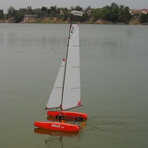 The Ninja1000 is the smaller brother of the Ninja a AC45 style slim hulled Catamaran designed by Roland and build by RCSails. The boat has slim hulls only 8.5 cm wide. The beam of 1000mm can be altered easily to get wider or narrower beam by adjusting the length of the beam tubes. With the included T-foil rudder the Ninja is fast and stable.